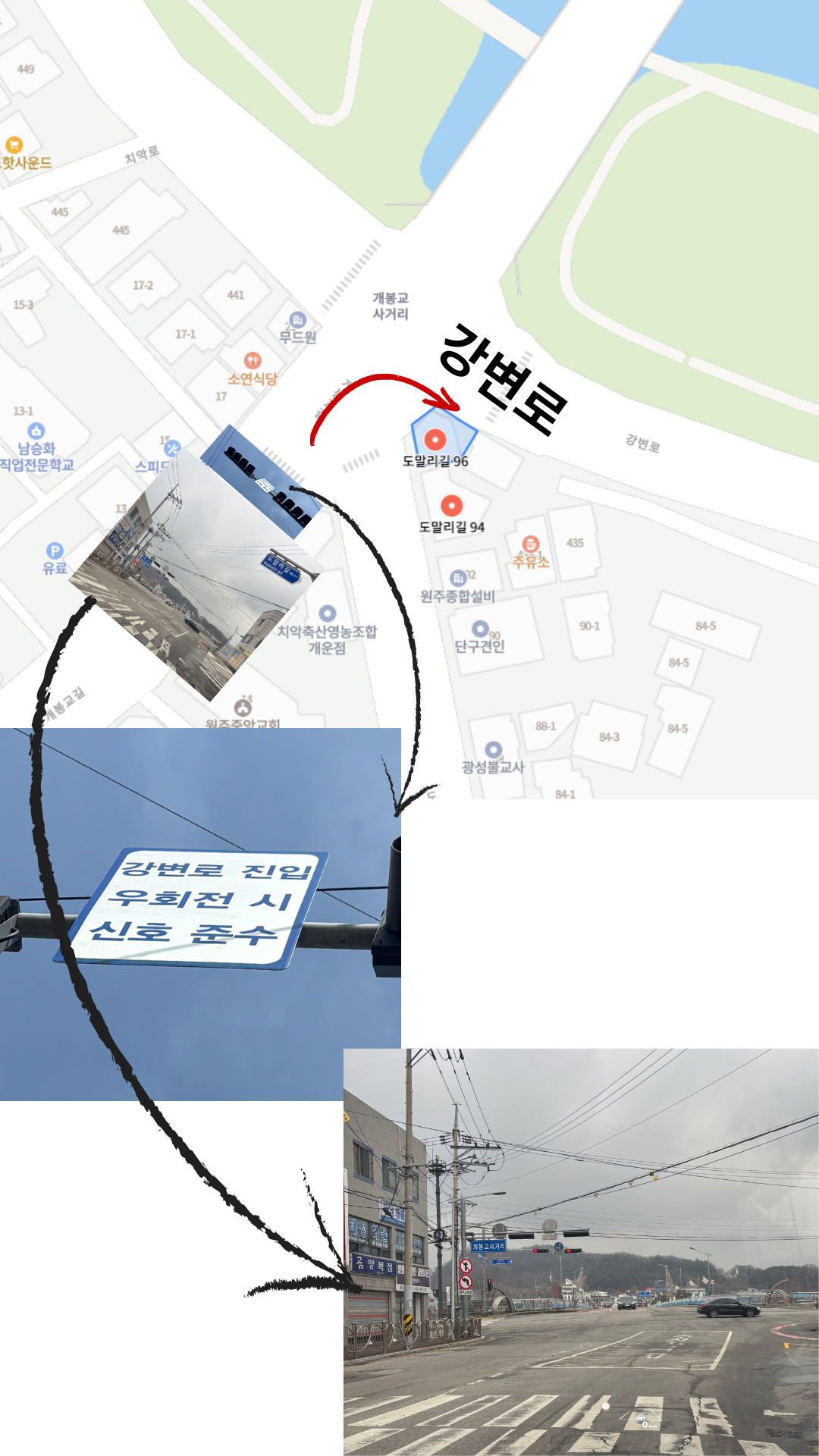 도로 지도 입니다. 빨간색 화살표 방향으로 우회전시 신호 체계를 어떻게 해석해야 할까요?