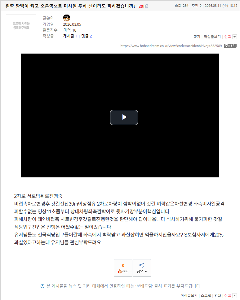 [펑복] 왼쪽 깜빡이 켜고 오른쪽으로 미사일 투하 신이라도 피하겠습니까? (19) 이미지 26.03.11 17:37 추천 27 조회 6151 영상있어도독박가능 작성글보기 신고 댓글 추천 27 본 게시물을 뉴스 및 기타 매체에서 인용하실 때는 '보배드림' 출처 표기를 부탁드립니다 페북 트윗 밴드 카톡 카스 복사 스크랩 삭제 수정 신고 불법광고신고 목록