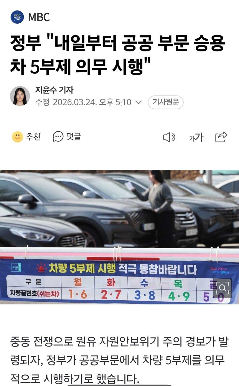 정부 내일부터 공공 부문 승용차 5부제 의무 시행 (4) 이미지 26.03.24 20:30 추천 15 조회 773 gjao 작성글보기 신고 댓글 https://n.news.naver.com/article/214/0001488326?sid=101민간은 자율에 맞긴다네요 추천 15 본 게시물을 뉴스 및 기타 매체에서 인용하실 때는 '보배드림' 출처 표기를 부탁드립니다 페북 트윗 밴드 카톡 카스 복사 스크랩 삭제 수정 신고 불법광고신고 목록