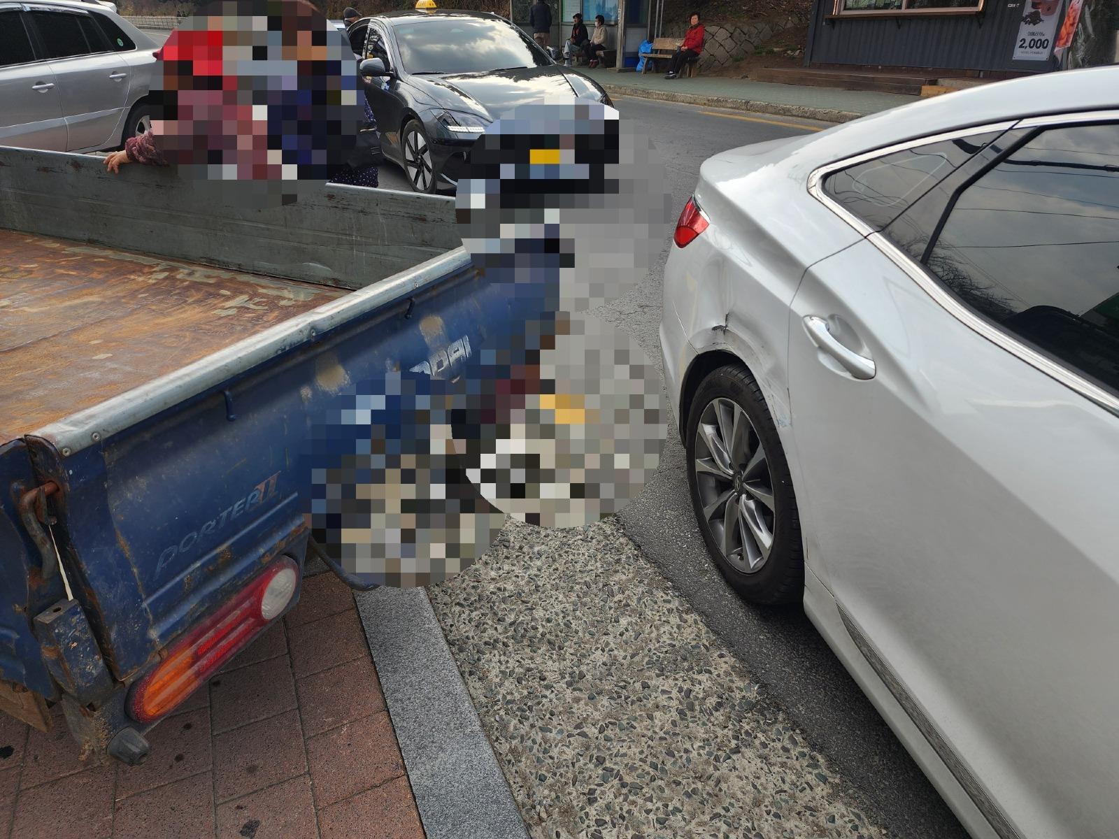 거의 다 지나간 뒤에 트럭이 갑자기 후진하며 뒤휀더를 박았습니다.