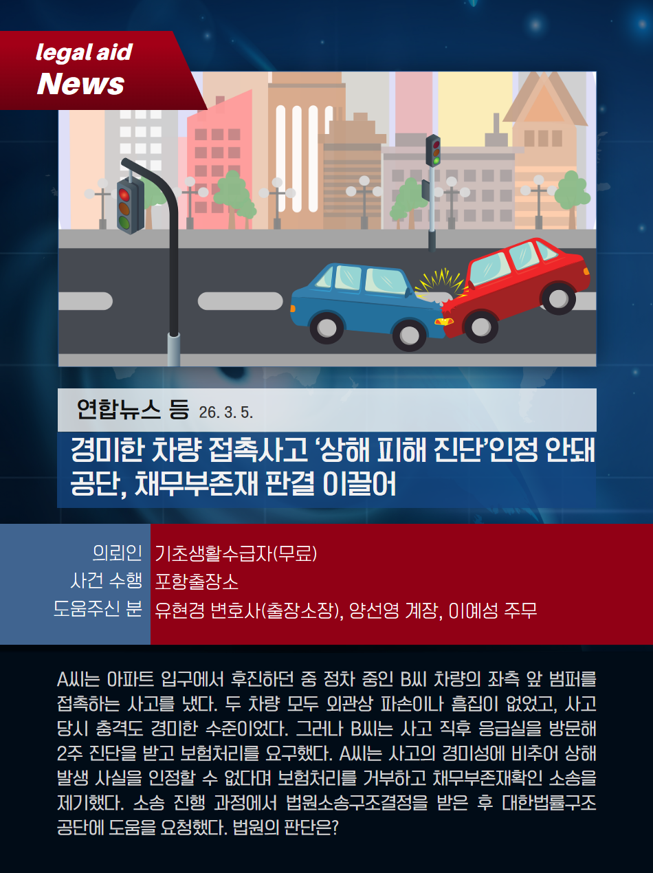 경미한 차량 접촉사고 상해 피해 진단인정 안돼 공단, 채무부존재 판결 이끌어 (7) 이미지 26.03.25 01:32 추천 54 조회 887 펫러브 작성글보기 신고 댓글 뉴스링크 ; http://www.yna.co.kr/view/AKR20260304175300004?input=1195m 추천 54 본 게시물을 뉴스 및 기타 매체에서 인용하실 때는 '보배드림' 출처 표기를 부탁드립니다 페북 트윗 밴드 카톡 카스 복사 스크랩 삭제 수정 신고 불법광고신고 목록