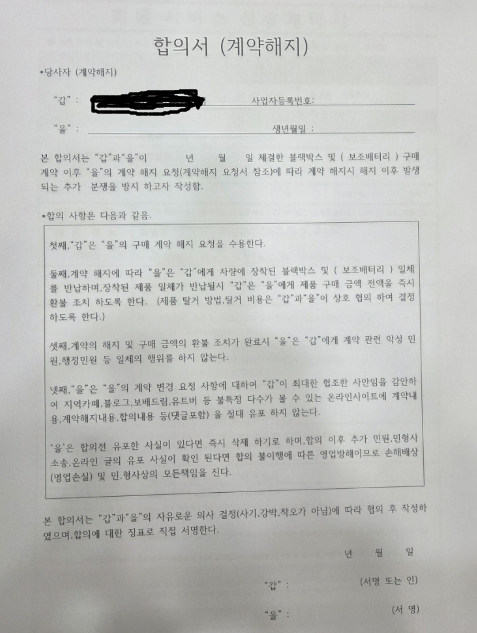 위 이미지는 블랙박스 회원제 사기업체들이 사기피해자들에게 들리미는 합의서 입니다.