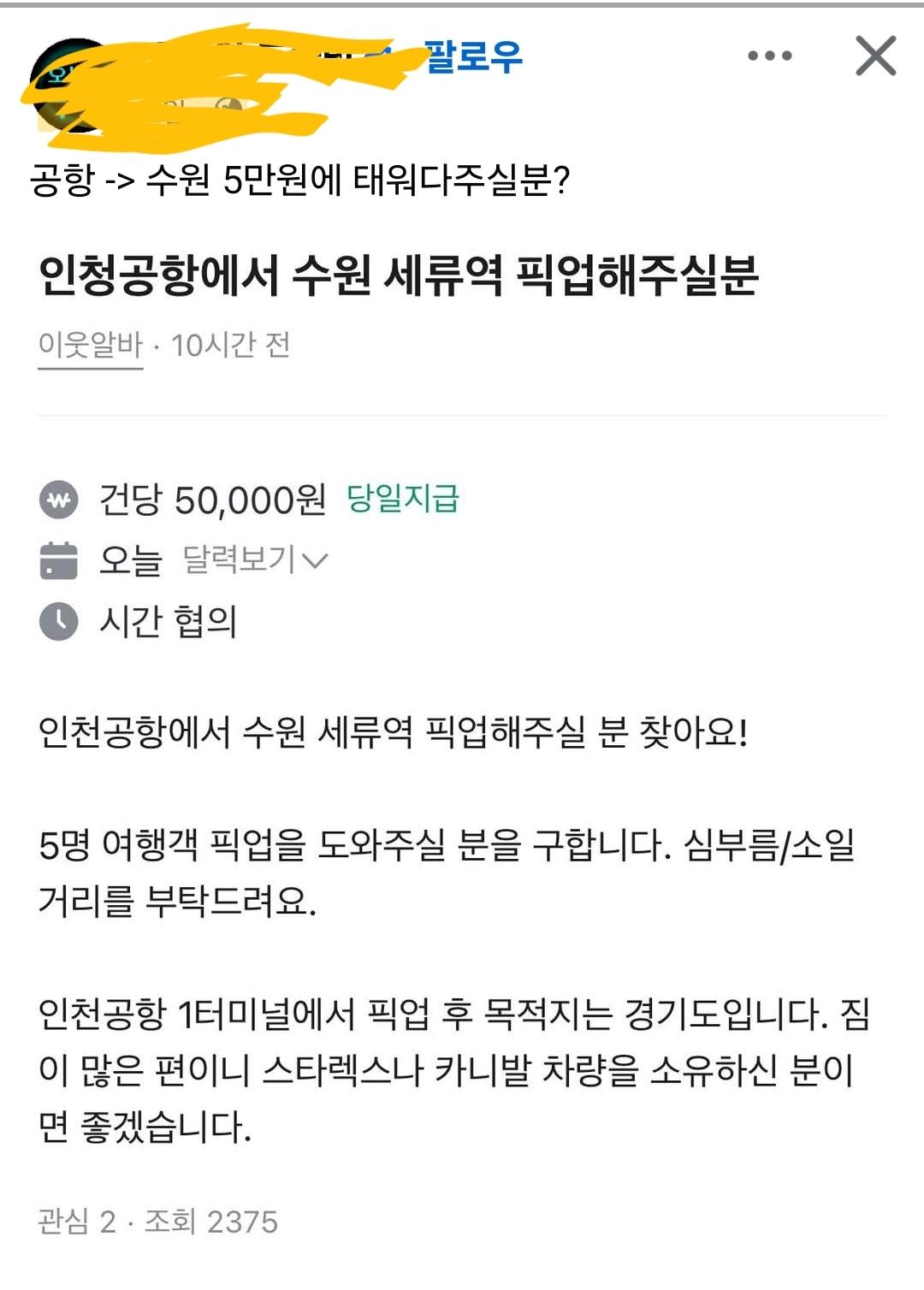 인천공항->수원 5명 o만원 카니발 찾아요 (20) 이미지 휴대전화 26.04.05 10:15 추천 35 조회 4970 수정 26.04.05 14:07 유대박맛집 작성글보기 신고 댓글 심부름,소일거리도 해주슈 추천 35 본 게시물을 뉴스 및 기타 매체에서 인용하실 때는 '보배드림' 출처 표기를 부탁드립니다 페북 트윗 밴드 카톡 카스 복사 스크랩 삭제 수정 신고 불법광고신고 목록