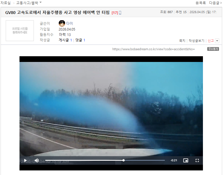 [펑하셨네] GV80 고속도로에서 자율주행 중 사고났다는 당신 (36) 이미지 26.04.05 23:33 추천 169 조회 4566 앞뒤꽉꽉 작성글보기 신고 댓글 * 출처 : 보배드림* 내용 1. GV80 고속도로에서 자율주행 중 사고났다는 당신. 2. 자율주행은 없습니다. 3. 핸들 똑바로 잡고 운전합시다. 끝. 추천 169 본 게시물을 뉴스 및 기타 매체에서 인용하실 때는 '보배드림' 출처 표기를 부탁드립니다 페북 트윗 밴드 카톡 카스 복사 스크랩 삭제 수정 신고 불법광고신고 목록