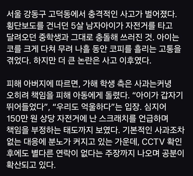 험 주의] 횡단보도서 5살아이 친 중학생 (11) 이미지 26.04.08 09:52 추천 34 조회 1676 수정 26.04.08 09:52 gjao 작성글보기 신고 댓글 가해자 중학생 부모 어이 없네요. 횡단 보도를 건너던 5샇 여자아이와 사고가 낫는데 사과도 안하고 자전거 스크레치 이야기 하니 말입니다 추천 34 본 게시물을 뉴스 및 기타 매체에서 인용하실 때는 '보배드림' 출처 표기를 부탁드립니다 페북 트윗 밴드 카톡 카스 복사 스크랩 삭제 수정 신고 불법광고신고 목록