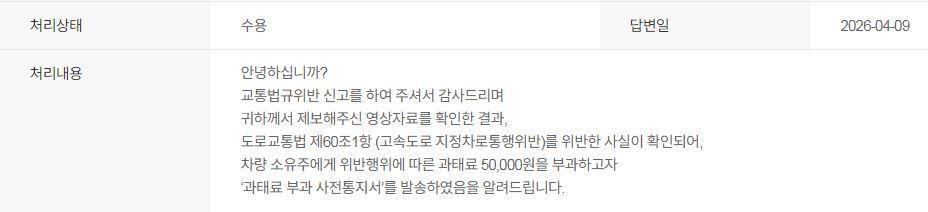 이후 추월 및 상황 정리를 위해 바로 2차로로 복귀한 상태였으며,