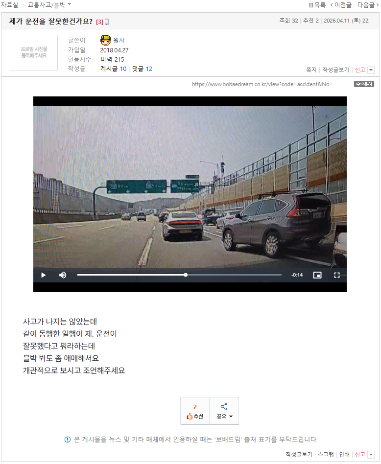 [펑하셨네] 본인이 운전을 잘못한거냐는 당신 (12) 이미지 26.04.12 23:33 추천 29 조회 1556 앞뒤꽉꽉 작성글보기 신고 댓글 * 출처 : 보배드림* 내용 1. 본인이 운전을 잘못한거냐는 당신. 2. 네, 못하는게 맞습니다. 3. 안전운전 합시다. 끝. 추천 29 본 게시물을 뉴스 및 기타 매체에서 인용하실 때는 '보배드림' 출처 표기를 부탁드립니다 페북 트윗 밴드 카톡 카스 복사 스크랩 삭제 수정 신고 불법광고신고 목록
