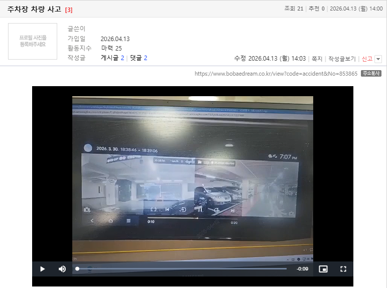[펑복] 주차장 차량 사고 (10) 이미지 26.04.13 14:18 추천 22 조회 1029 애덤댕킹 작성글보기 신고 댓글 내용 확인 후 마력회복하세요. 추천 22 본 게시물을 뉴스 및 기타 매체에서 인용하실 때는 '보배드림' 출처 표기를 부탁드립니다 페북 트윗 밴드 카톡 카스 복사 스크랩 삭제 수정 신고 불법광고신고 목록