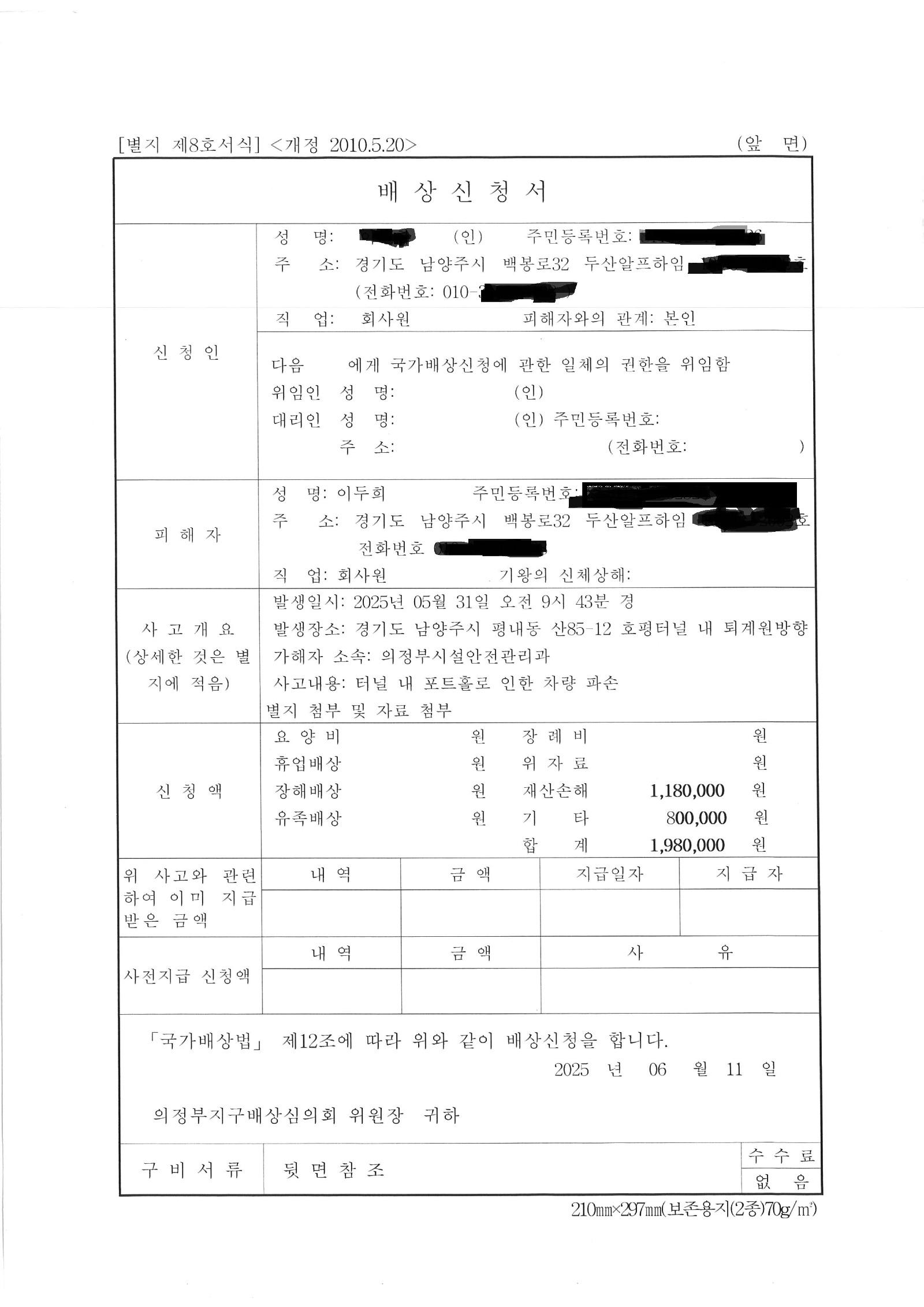 사고 영상은 블박전방, 후방 영상 올렸으며, 국가배상 신청자료 및 결과자료 올려드립니다.