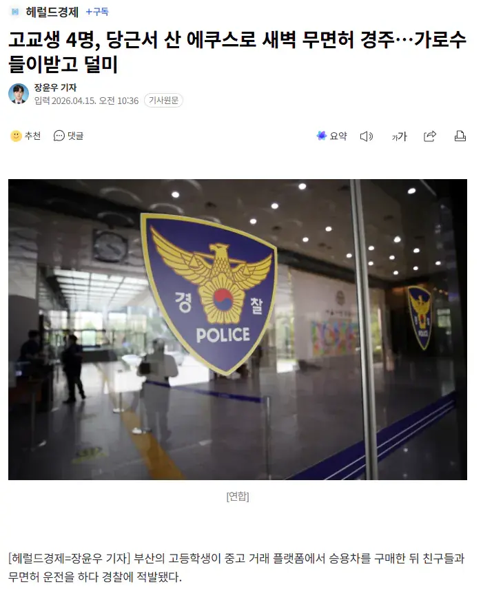 15일 부산 금정경찰서에 따르면 지난달 7일 오전 3시 30분쯤 부산 금정구 두구동에서 에쿠스 차량이 주행 중 가로수를 들이받는 사고를 냈다. 경찰이 출동해 운전자를 확인한 결과 고등학생 A 군으로 파악됐다.
