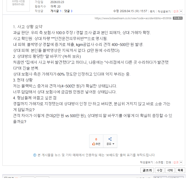 증거 유출 같은 개헛소리를 하고 자빠졌어 (11) 이미지 26.04.15 16:08 추천 31 조회 2913 수정 26.04.15 16:08 아무우 작성글보기 신고 댓글 블박 올리랬더니 증거 유출이라 안된다고 함 나가 임마 추천 31 본 게시물을 뉴스 및 기타 매체에서 인용하실 때는 '보배드림' 출처 표기를 부탁드립니다 페북 트윗 밴드 카톡 카스 복사 스크랩 삭제 수정 신고 불법광고신고 목록