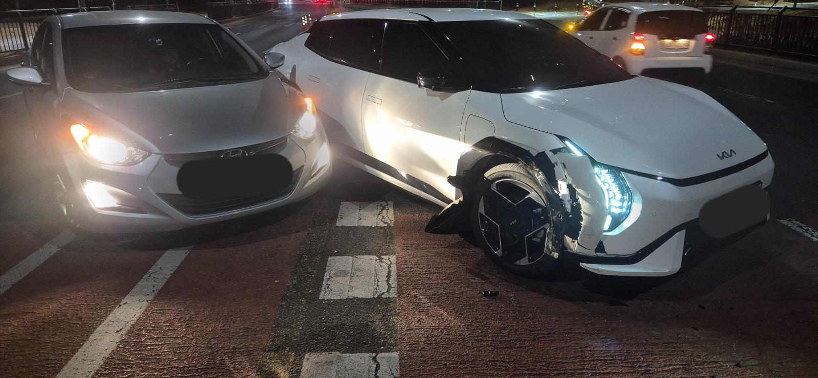 찰나의 순간 피하기위해 핸들을 왼쪽으로 꺾으면서 브레이크를 밟으며 반대차선까지 갔지만 사고가 났네요.