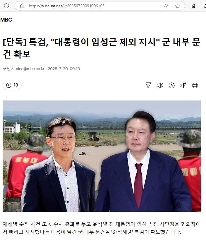 특검, "대통령이 임성근 제외 지시" 군 내부 문건 확보 (5) 이미지 25.07.20 09:27 추천 22 조회 1916 NoBady 작성글보기 신고 댓글 임성근, 개신교계 통해 尹 부부에 줄 댔나https://www.youtube.com/watch?v=5PABJXcB378 +_+ 추천 22 본 게시물을 뉴스 및 기타 매체에서 인용하실 때는 '보배드림' 출처 표기를 부탁드립니다 페북 트윗 밴드 카톡 카스 복사 스크랩 삭제 수정 신고 불법광고신고 목록