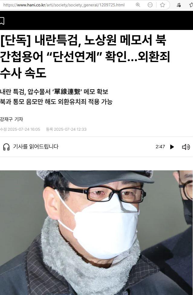 내란특검, 노상원 메모서 북 간첩용어 “단선연계” 확인…외환죄 수사 속도 이미지 25.07.24 17:02 추천 9 조회 963 NoBady 작성글보기 신고 댓글 +_+ 추천 9 본 게시물을 뉴스 및 기타 매체에서 인용하실 때는 '보배드림' 출처 표기를 부탁드립니다 페북 트윗 밴드 카톡 카스 복사 스크랩 삭제 수정 신고 불법광고신고 목록