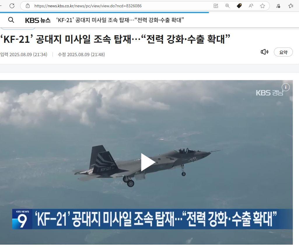 KF-21 공대지 미사일 조속 탑재...전력 강화·수출 확대 (9) 이미지 25.08.11 13:37 추천 19 조회 3784 NoBady 작성글보기 신고 댓글 공대지 미사일 2028년 말에서 2027년 초로 앞당겨... KAI, KF-21EX 5세대 방향 발표https://www.bobaedream.co.kr/view?code=army&No=132467 +_+ 추천 19 본 게시물을 뉴스 및 기타 매체에서 인용하실 때는 '보배드림' 출처 표기를 부탁드립니다 페북 트윗 밴드 카톡 카스 복사 스크랩 삭제 수정 신고 불법광고신고 목록