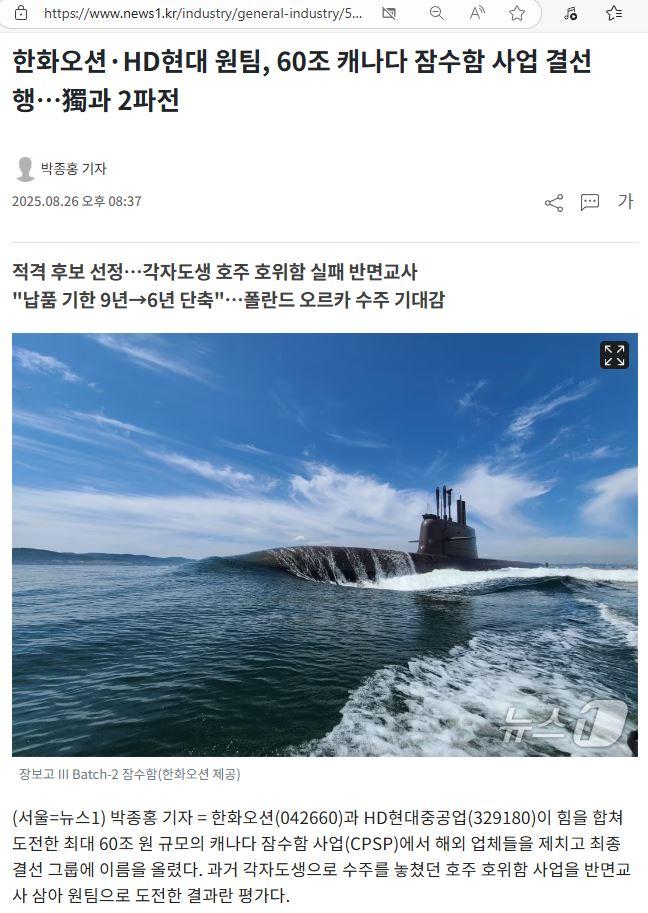 한화오션·HD현대 원팀, 60조 캐나다 잠수함 사업 결선행/독일과 2파전 (7) 이미지 25.08.26 23:10 추천 14 조회 2846 NoBady 작성글보기 신고 댓글 +_+ 추천 14 본 게시물을 뉴스 및 기타 매체에서 인용하실 때는 '보배드림' 출처 표기를 부탁드립니다 페북 트윗 밴드 카톡 카스 복사 스크랩 삭제 수정 신고 불법광고신고 목록