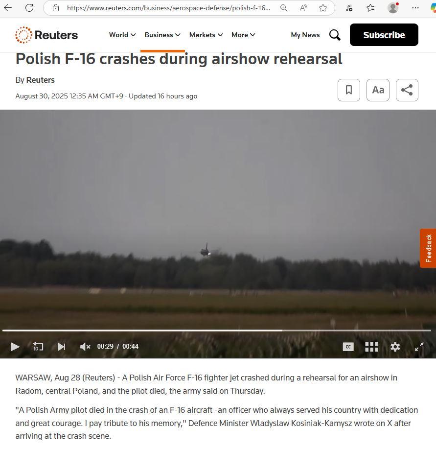 폴란드 F-16 에어쇼 리어설 중 지면 충돌... (7) 이미지 25.08.30 17:39 추천 2 조회 2631 NoBady 작성글보기 신고 댓글 +_+ 추천 2 본 게시물을 뉴스 및 기타 매체에서 인용하실 때는 '보배드림' 출처 표기를 부탁드립니다 페북 트윗 밴드 카톡 카스 복사 스크랩 삭제 수정 신고 불법광고신고 목록