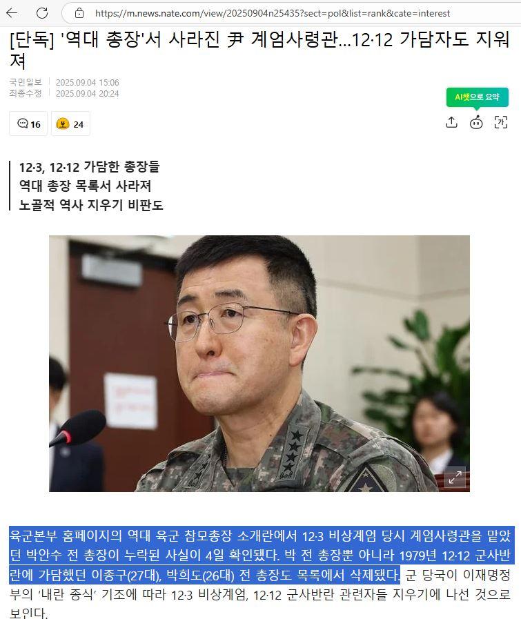 '역대 총장'서 사라진 군 계엄사령관…12·12 가담자도 지워져 (1) 이미지 25.09.05 15:49 추천 10 조회 2120 NoBady 작성글보기 신고 댓글 +_+ 추천 10 본 게시물을 뉴스 및 기타 매체에서 인용하실 때는 '보배드림' 출처 표기를 부탁드립니다 페북 트윗 밴드 카톡 카스 복사 스크랩 삭제 수정 신고 불법광고신고 목록
