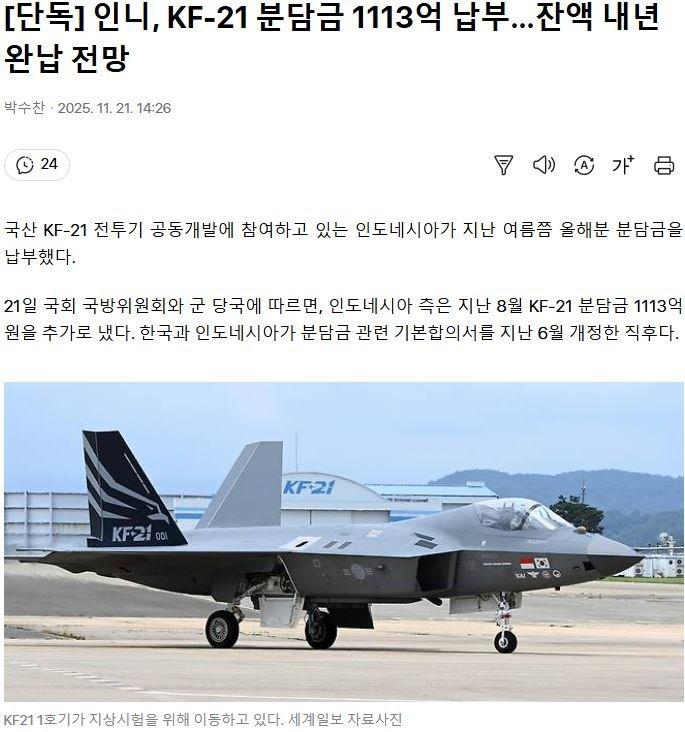 인니 KF-21 분담금 1113억 납부 (21) 이미지 25.11.21 15:42 추천 15 조회 3870 볶아나오는탕수육 작성글보기 신고 댓글 진상뻘짓 하다가 무슨 꿍꿍이로 돈을낸건지...? 추천 15 본 게시물을 뉴스 및 기타 매체에서 인용하실 때는 '보배드림' 출처 표기를 부탁드립니다 페북 트윗 밴드 카톡 카스 복사 스크랩 삭제 수정 신고 불법광고신고 목록