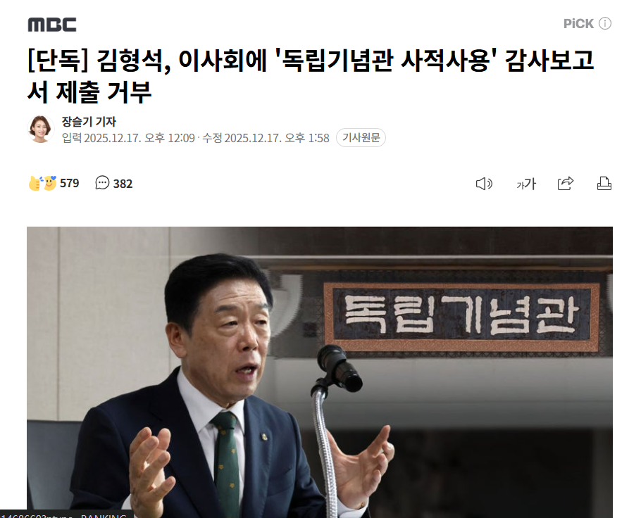 [단독] 독립기념관장, '독립기념관 사적사용 감사보고서' 제출 거부 (3) 이미지 25.12.17 15:10 추천 31 조회 2478 납세의무 작성글보기 신고 댓글 독립기념관장이라는 작자가 불법행위를 저지르고 있는데 임기보장은 커녕 당장 기소후 수사부터 해야할 사안인데 언제까지 역사왜곡에 앞장서는 민족반역자를 독립기념관을 사유화하는데도 방치하고 있는걸까요 추천 31 본 게시물을 뉴스 및 기타 매체에서 인용하실 때는 '보배드림' 출처 표기를 부탁드립니다 페북 트윗 밴드 카톡 카스 복사 스크랩 삭제 수정 신고 불법광고신고 목록