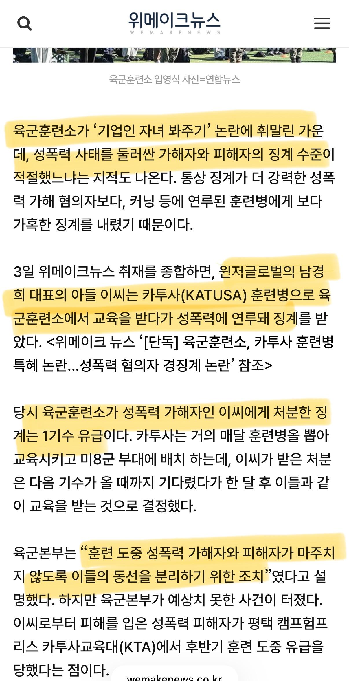 [단독] 육군훈련소, 카투사 훈련병 특혜 논란...성폭력 혐의자 경징계 논란https://wemakenews.co.kr/news/view.php?no=24489