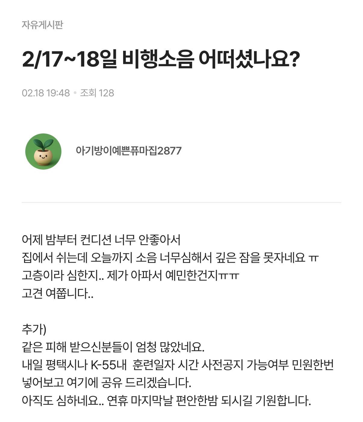 미군/한국군 비공식(혹은 비상) 훈련일자 및 시간을 어떻게 사전공지 해야 하는건지, 본인이 비행장 바로 옆에 집을 사놓고 뭘 또 민원을 넣겠다는 건지.. 군대를 다녀온 사람인건지.. 안보의식이 있는 사람인건지 참 답답합니다.