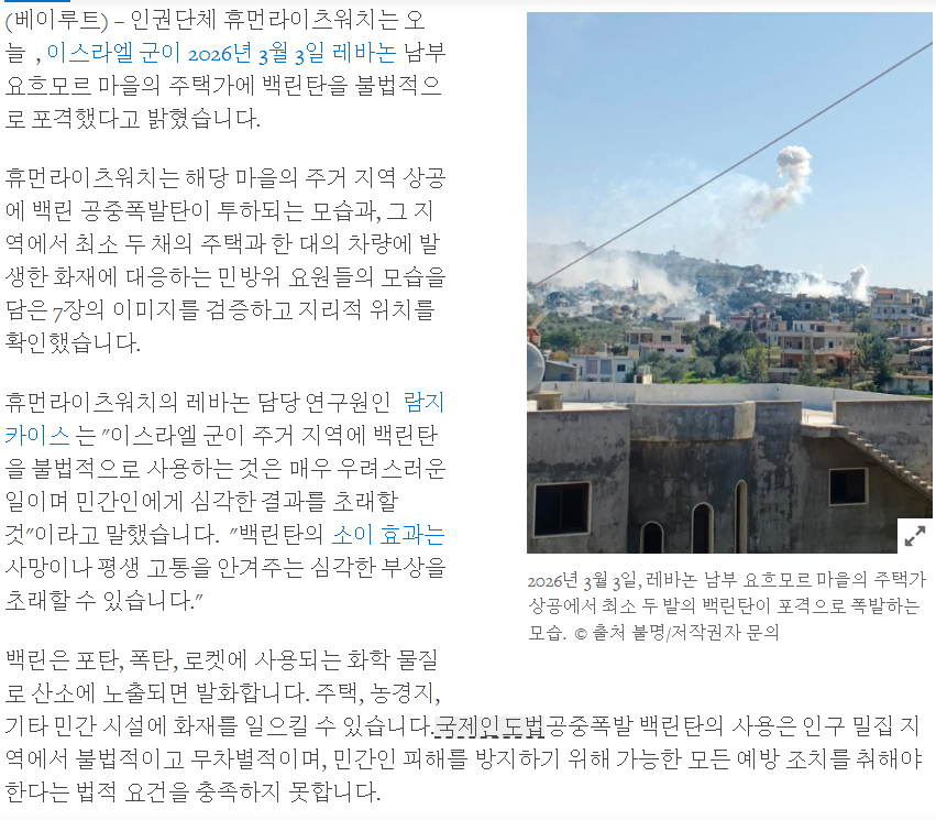 이스라엘 레바논에 백린탄 사용 (1) 이미지 26.03.10 15:30 추천 8 조회 2942 벌의연금 작성글보기 신고 댓글 추천 8 본 게시물을 뉴스 및 기타 매체에서 인용하실 때는 '보배드림' 출처 표기를 부탁드립니다 페북 트윗 밴드 카톡 카스 복사 스크랩 삭제 수정 신고 불법광고신고 목록