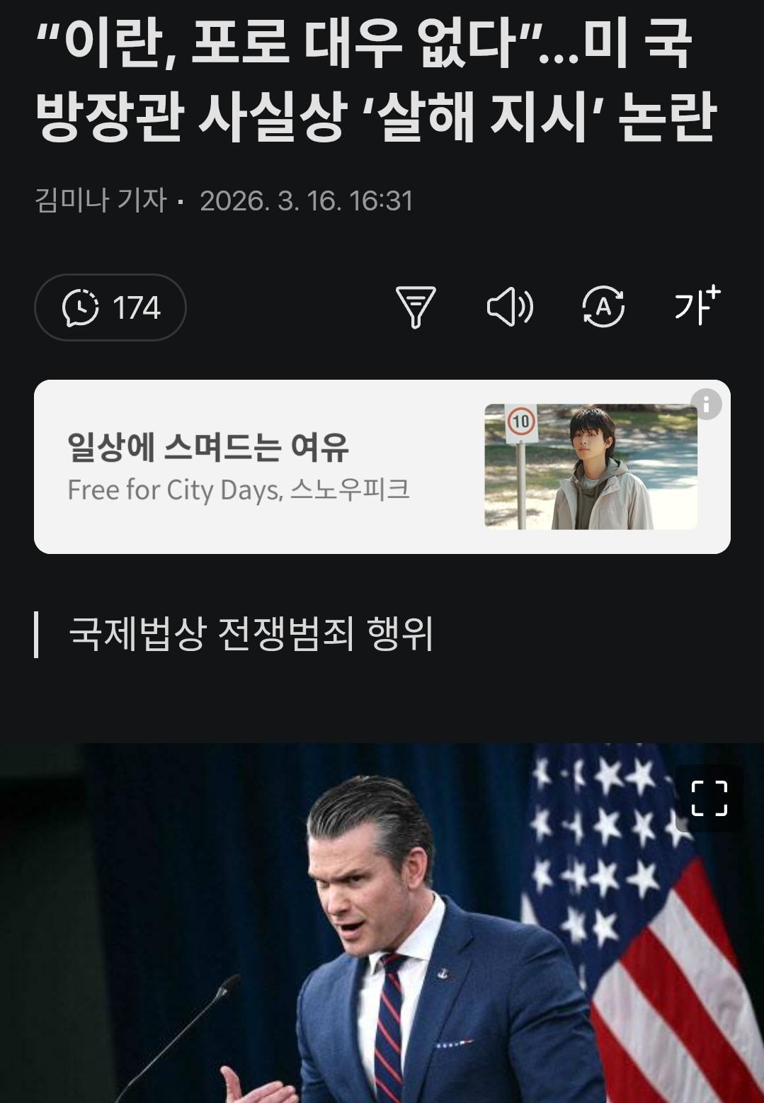 미 국방 장관, 포로 잡으면 포로 대우 안한다. (7) 이미지 휴대전화 26.03.16 17:53 추천 23 조회 3084 수정 26.03.16 17:54 벌의연금 작성글보기 신고 댓글 이란군 포로로 잡으면 고문도 하고 죽이기도 하겠다 란 의미 추천 23 본 게시물을 뉴스 및 기타 매체에서 인용하실 때는 '보배드림' 출처 표기를 부탁드립니다 페북 트윗 밴드 카톡 카스 복사 스크랩 삭제 수정 신고 불법광고신고 목록