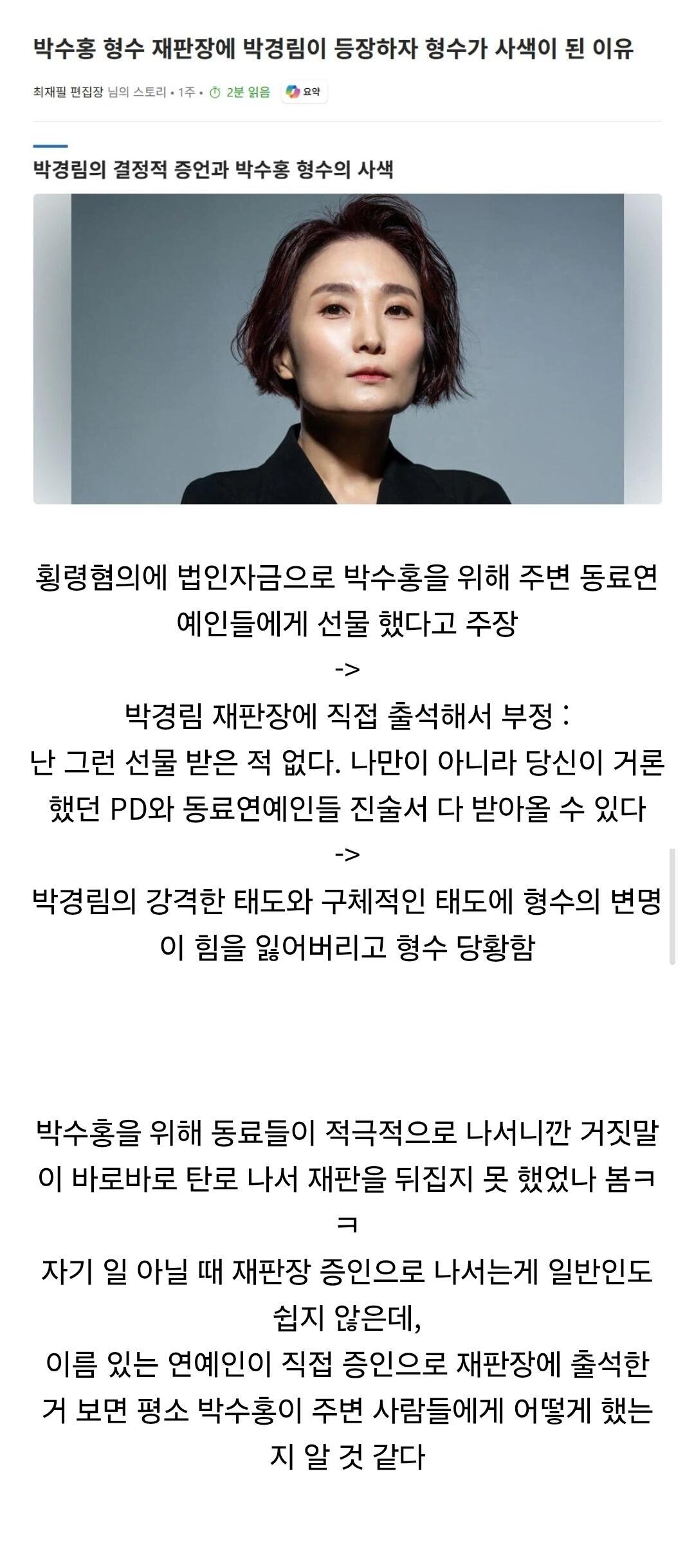박수홍이 가정사로 힘든 시기를 겪을 때 박경림은 밤새 전화로 위로해주고 명절 음식까지 챙겨주는 등 정서적 지주 역할을 했습니다.