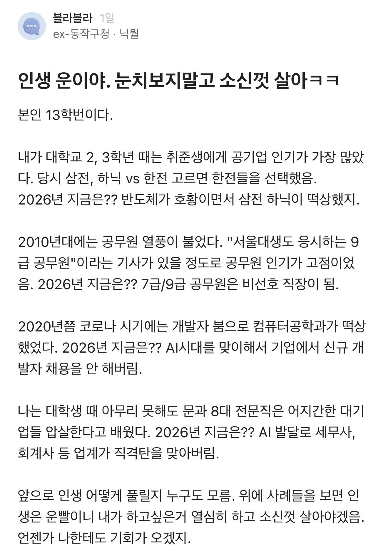 13 학번이 말하는 인생은 운이 중요한 이유 (2) 이미지 26.04.18 09:14 추천 0 조회 1171 나아닌너 작성글보기 신고 댓글 추천 0 본 게시물을 뉴스 및 기타 매체에서 인용하실 때는 '보배드림' 출처 표기를 부탁드립니다 페북 트윗 밴드 카톡 카스 복사 스크랩 삭제 수정 신고 불법광고신고 목록