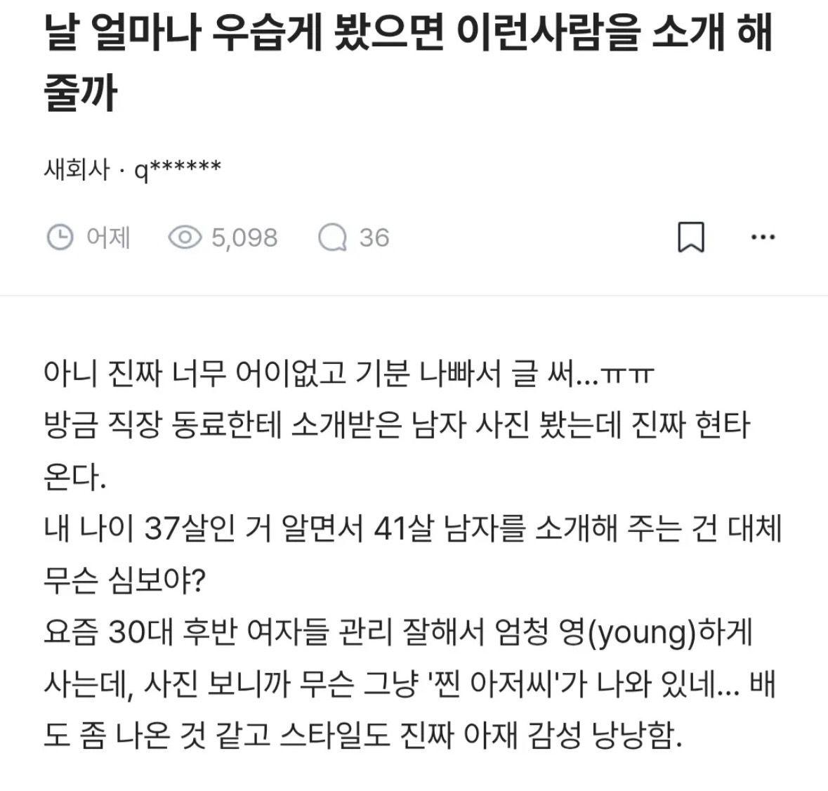 남자 소개받고 기분상한 37살 ㅊㅈ (13) 이미지 26.04.18 09:20 추천 10 조회 3388 곧휴꺄꺄 작성글보기 신고 댓글 추천 10 본 게시물을 뉴스 및 기타 매체에서 인용하실 때는 '보배드림' 출처 표기를 부탁드립니다 페북 트윗 밴드 카톡 카스 복사 스크랩 삭제 수정 신고 불법광고신고 목록