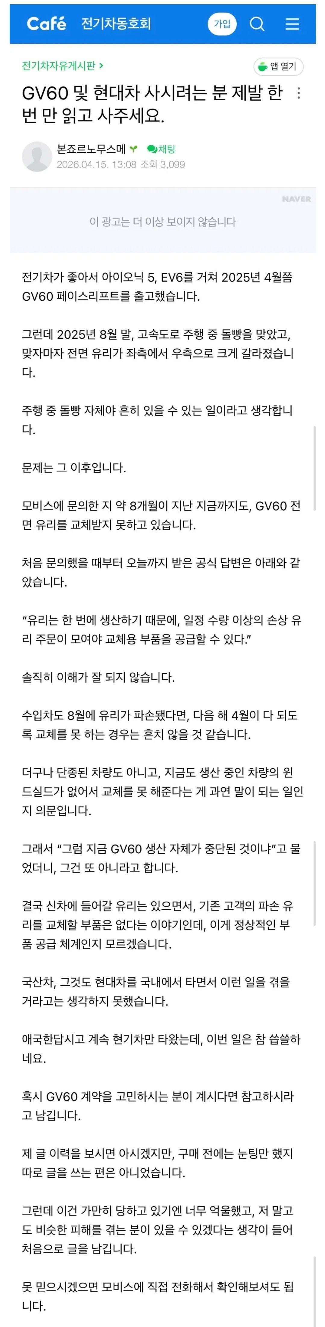 개빡친 GV60 오너 ㄷㄷ (2) 이미지 26.04.18 12:07 추천 13 조회 3332 곧휴꺄꺄 작성글보기 신고 댓글 추천 13 본 게시물을 뉴스 및 기타 매체에서 인용하실 때는 '보배드림' 출처 표기를 부탁드립니다 페북 트윗 밴드 카톡 카스 복사 스크랩 삭제 수정 신고 불법광고신고 목록