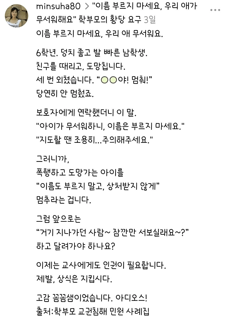 어느 초딩학부모의 민원 (7) 이미지 26.04.20 08:34 추천 9 조회 1631 걸인28호 작성글보기 신고 댓글 요즘 부모들은 자식 인성교육시키면 죽는 병이라도 걸렸나 추천 9 본 게시물을 뉴스 및 기타 매체에서 인용하실 때는 '보배드림' 출처 표기를 부탁드립니다 페북 트윗 밴드 카톡 카스 복사 스크랩 삭제 수정 신고 불법광고신고 목록