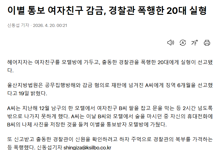 이별 통보 여친 모텔 감금 20대 징역 6개월