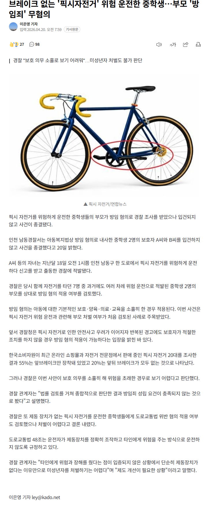 브레이크 없는 '픽시자전거' 위험 운전한 중학생 (8) 이미지 26.04.20 13:27 추천 4 조회 1369 진햅 작성글보기 신고 댓글 https://n.news.naver.com/article/654/0000176564?ntype=RANKING픽시자전거 못타게 해야합니다 추천 4 본 게시물을 뉴스 및 기타 매체에서 인용하실 때는 '보배드림' 출처 표기를 부탁드립니다 페북 트윗 밴드 카톡 카스 복사 스크랩 삭제 수정 신고 불법광고신고 목록