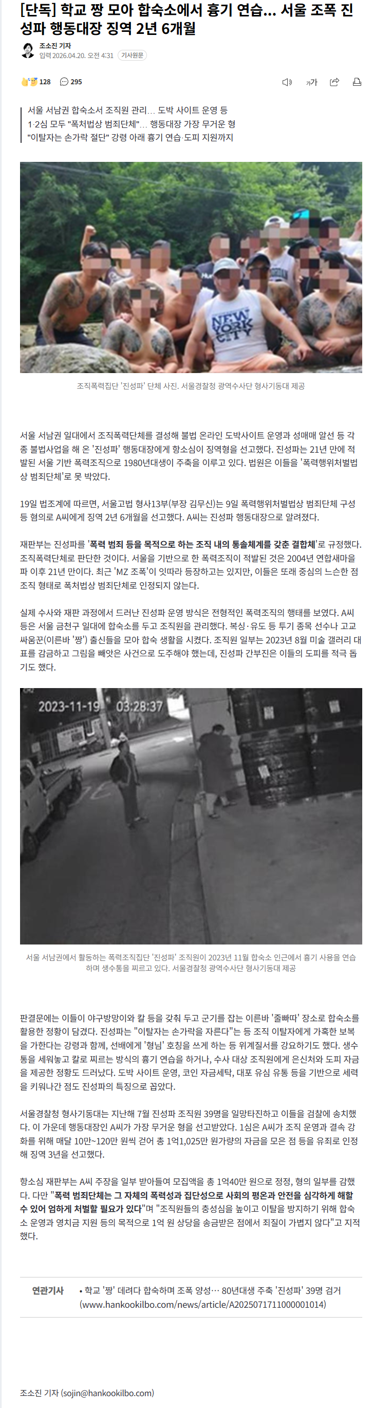 학교 짱 모아 합숙소에서 흉기 연습 (1) 이미지 26.04.20 13:50 추천 5 조회 2126 진햅 작성글보기 신고 댓글 https://n.news.naver.com/article/469/0000926343?ntype=RANKING 추천 5 본 게시물을 뉴스 및 기타 매체에서 인용하실 때는 '보배드림' 출처 표기를 부탁드립니다 페북 트윗 밴드 카톡 카스 복사 스크랩 삭제 수정 신고 불법광고신고 목록