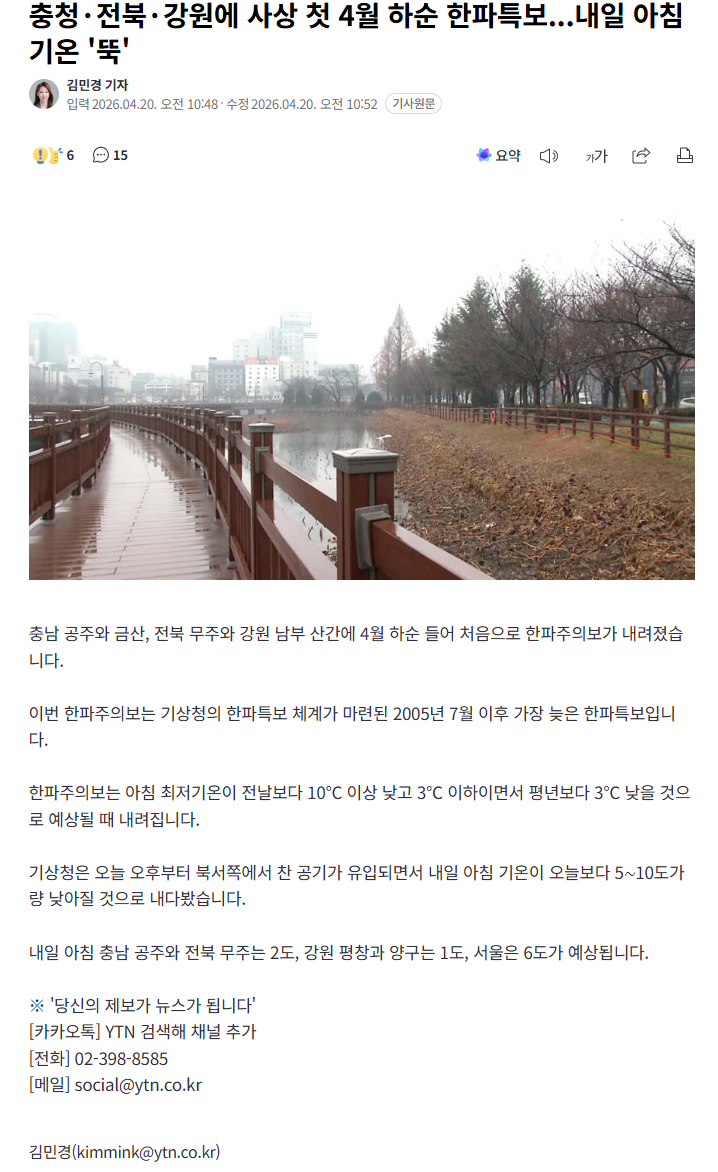 충청·전북·강원에 사상 첫 4월 하순 한파특보 (2) 이미지 26.04.20 14:19 추천 0 조회 1574 진햅 작성글보기 신고 댓글 https://n.news.naver.com/article/052/0002343087?ntype=RANKING여기는 한파라니 소름이네요 추천 0 본 게시물을 뉴스 및 기타 매체에서 인용하실 때는 '보배드림' 출처 표기를 부탁드립니다 페북 트윗 밴드 카톡 카스 복사 스크랩 삭제 수정 신고 불법광고신고 목록