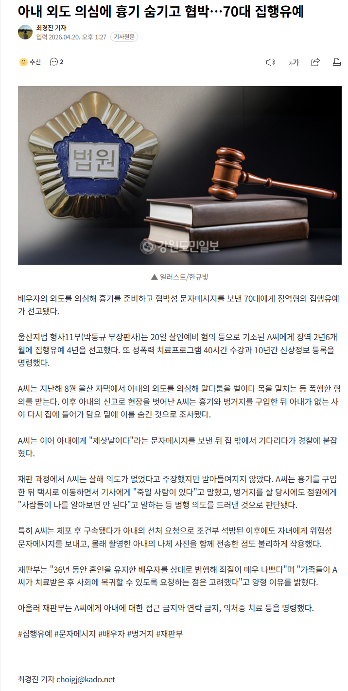 아내 외도 의심에 흉기 숨기고 협박…70대 집행유예 (6) 이미지 26.04.20 15:03 추천 0 조회 1819 진햅 작성글보기 신고 댓글 https://n.news.naver.com/article/654/0000176600?ntype=RANKING 추천 0 본 게시물을 뉴스 및 기타 매체에서 인용하실 때는 '보배드림' 출처 표기를 부탁드립니다 페북 트윗 밴드 카톡 카스 복사 스크랩 삭제 수정 신고 불법광고신고 목록