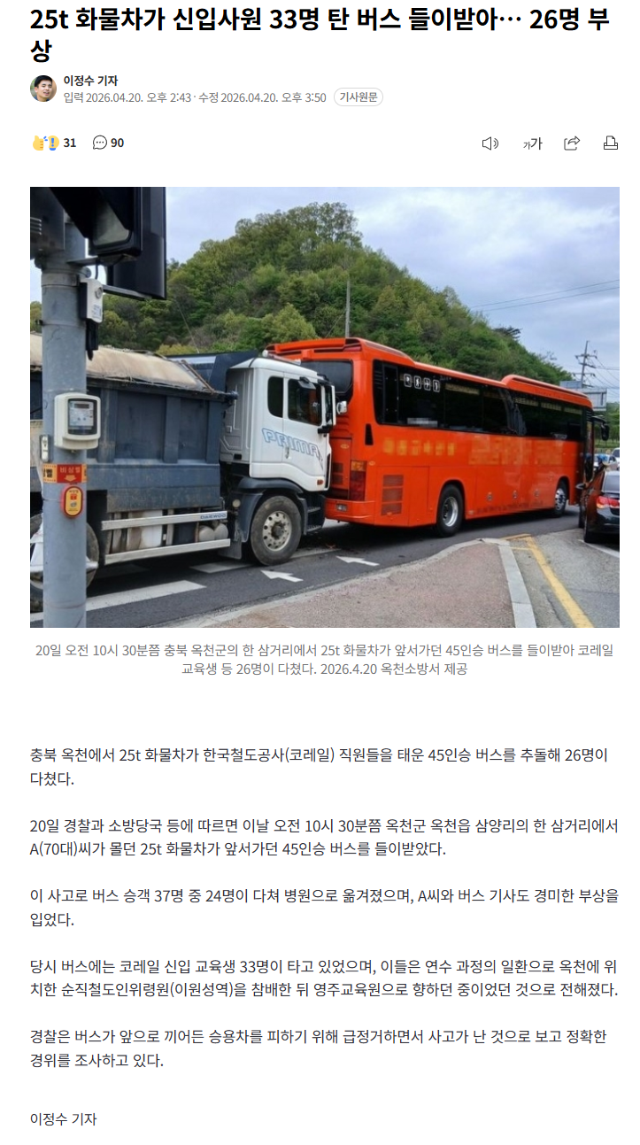 25t 화물차가 신입사원 33명 탄 버스 들이받아 (9) 이미지 26.04.20 15:55 추천 7 조회 2308 진햅 작성글보기 신고 댓글 https://n.news.naver.com/article/081/0003636896?ntype=RANKING26명 전부다 대인들어가면 어휴 추천 7 본 게시물을 뉴스 및 기타 매체에서 인용하실 때는 '보배드림' 출처 표기를 부탁드립니다 페북 트윗 밴드 카톡 카스 복사 스크랩 삭제 수정 신고 불법광고신고 목록