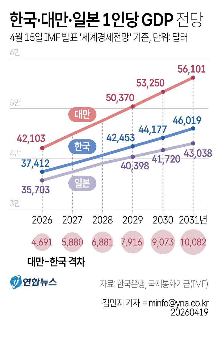 (서울=연합뉴스) 김민지 기자 = 19일 한국은행 등에 따르면 우리나라 국민 1인당 실질 국내총생산(GDP) 수준이 5년 뒤 대만보다 1만달러 이상 뒤처지게 될 것이라는 국제통화기금(IMF) 전망이 나왔다.
