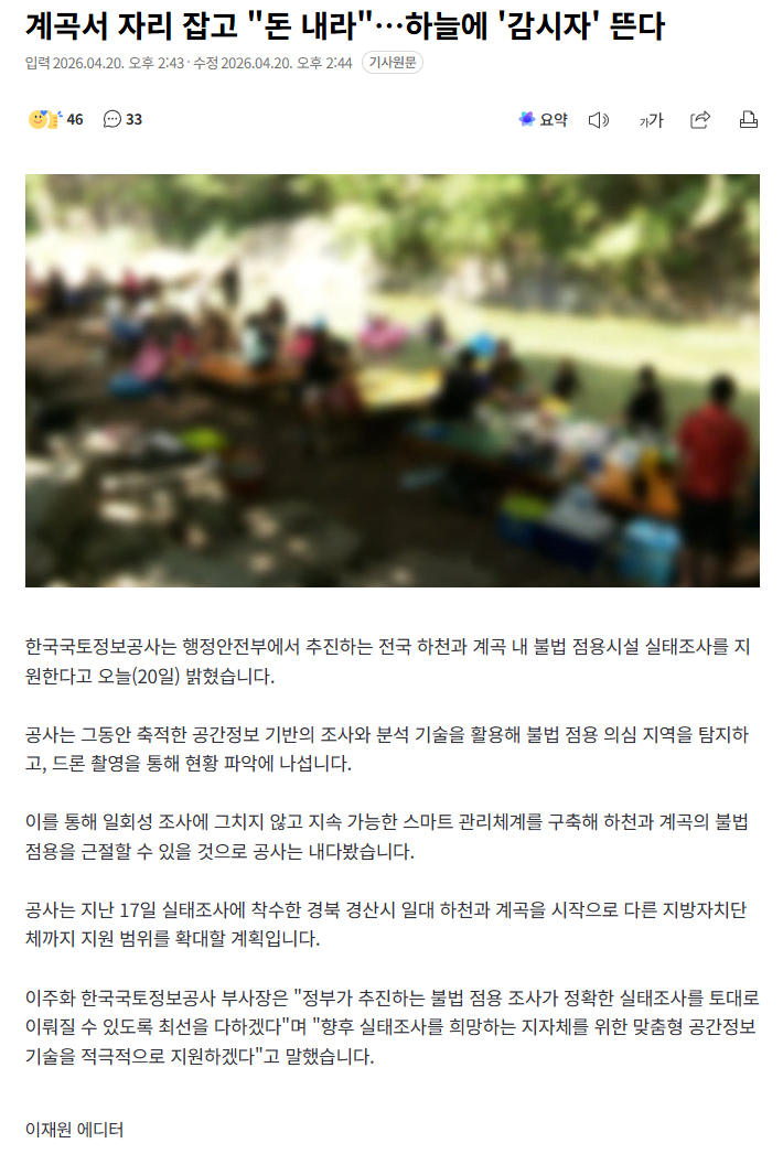 계곡서 자리 잡고 "돈 내라"…하늘에 '감시자' 뜬다 (6) 이미지 26.04.20 17:21 추천 14 조회 1594 진햅 작성글보기 신고 댓글 https://n.news.naver.com/article/055/0001349912?ntype=RANKING 추천 14 본 게시물을 뉴스 및 기타 매체에서 인용하실 때는 '보배드림' 출처 표기를 부탁드립니다 페북 트윗 밴드 카톡 카스 복사 스크랩 삭제 수정 신고 불법광고신고 목록