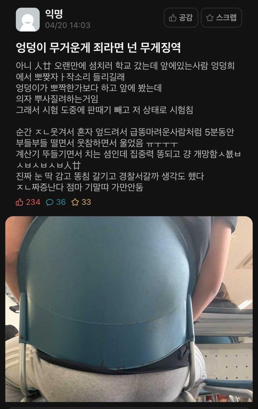 앞사람 엉덩이 때문에 시험 망친 사람 이미지 01:02 추천 7 조회 1075 카리스마4097 작성글보기 신고 댓글 추천 7 본 게시물을 뉴스 및 기타 매체에서 인용하실 때는 '보배드림' 출처 표기를 부탁드립니다 페북 트윗 밴드 카톡 카스 복사 스크랩 삭제 수정 신고 불법광고신고 목록