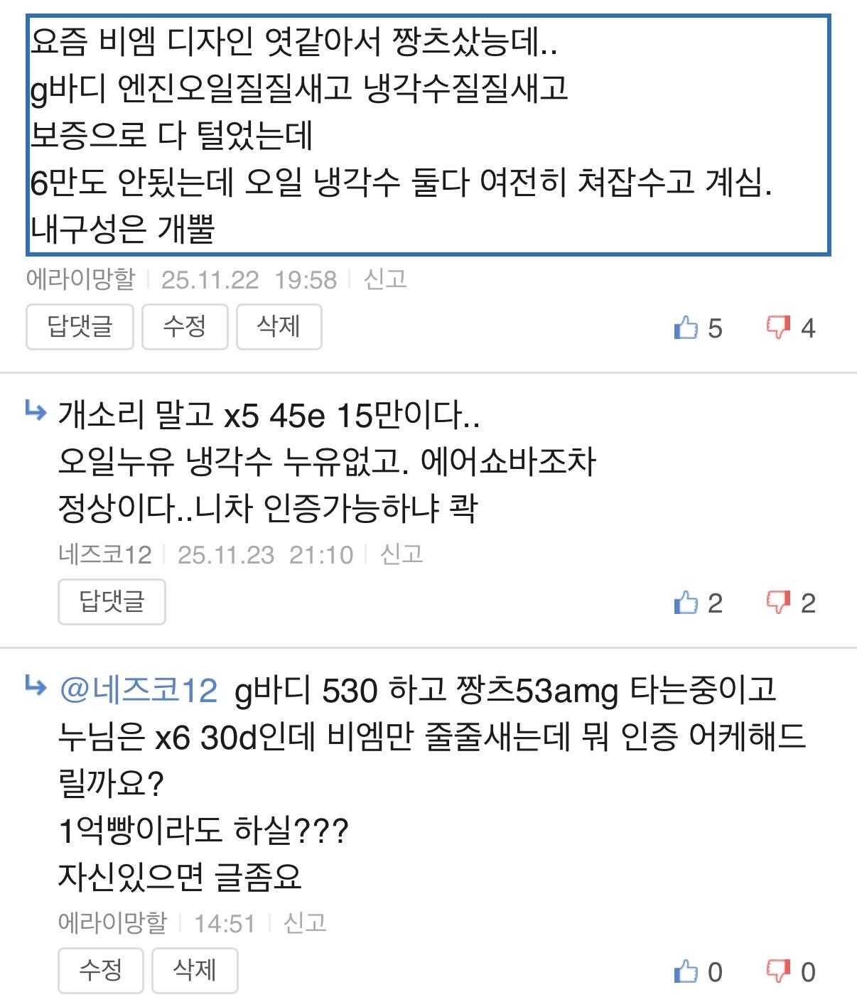 네즈코12님 얼마거실래요? (10) 이미지 휴대전화 25.11.24 14:56 추천 19 조회 1842 수정 25.11.24 15:13 에라이망할 작성글보기 신고 댓글 뭐 가짢게 좋은거 안타서 조용히 보배하는데 뭐 얼마거실랍니까? 백? 천? 억? 광신도도 아니고 적당히 빨아야지 ㅉ ㅉ 추천 19 본 게시물을 뉴스 및 기타 매체에서 인용하실 때는 '보배드림' 출처 표기를 부탁드립니다 페북 트윗 밴드 카톡 카스 복사 스크랩 삭제 수정 신고 불법광고신고 목록