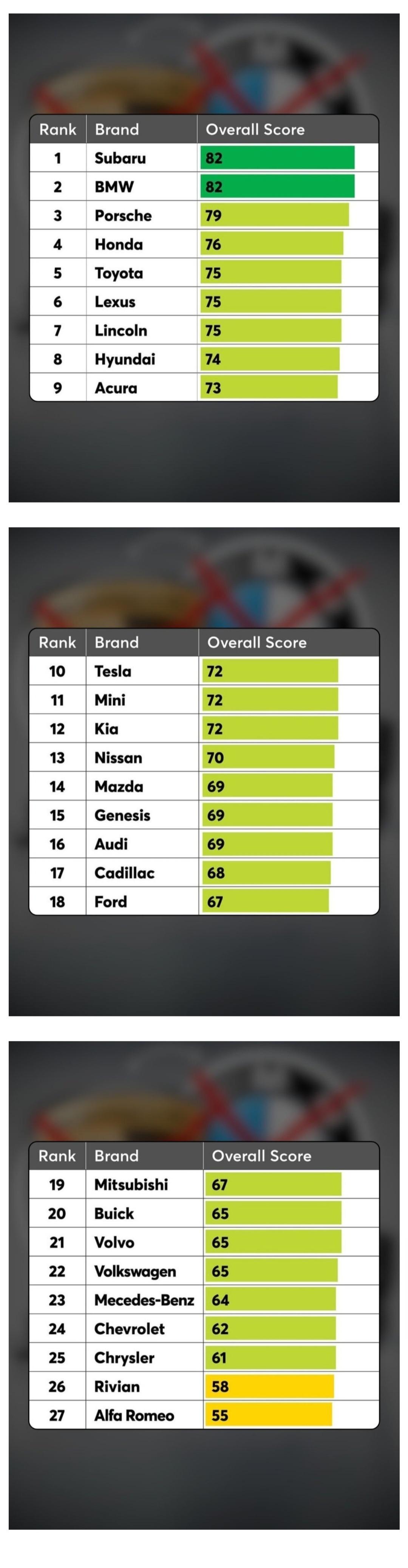 미국 컨슈머리포트 브랜드평가 순위 (20) 이미지 25.12.10 04:08 추천 30 조회 6516 수정 25.12.10 09:46 일차로는추월차로임 작성글보기 신고 댓글 전범기업이라 한국에서는 외면받는 스바루 1위 보배에서는 까이는 링컨 7위 현대 8위 기아 12위 제네시스 15위 한국에서는 연예인 마케팅으로 유난히 인기 좋은 볼보 21위 차는 벤츠지 23위 추천 30 본 게시물을 뉴스 및 기타 매체에서 인용하실 때는 '보배드림' 출처 표기를 부탁드립니다 페북 트윗 밴드 카톡 카스 복사 스크랩 삭제 수정 신고 불법광고신고 목록