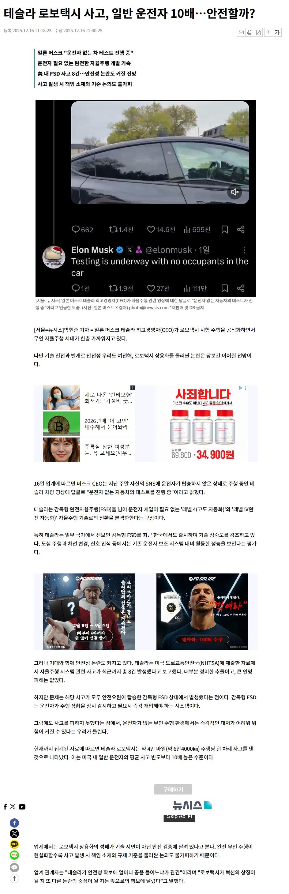 테슬라 로보택시 사고, 일반 운전자 10배…안전할까? (1) 이미지 25.12.17 01:24 추천 20 조회 3615 안데르숀 작성글보기 신고 댓글 www.newsis.com.jpeg" /> 추천 20 본 게시물을 뉴스 및 기타 매체에서 인용하실 때는 '보배드림' 출처 표기를 부탁드립니다 페북 트윗 밴드 카톡 카스 복사 스크랩 삭제 수정 신고 불법광고신고 목록