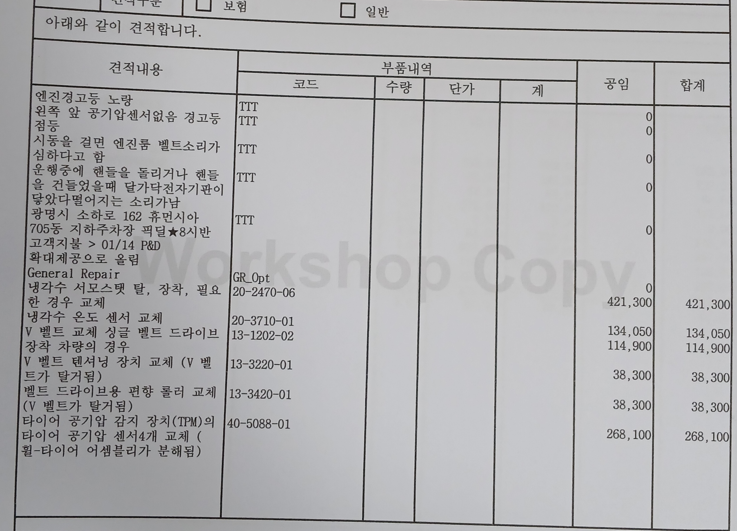 2. 공식 서비스센터에 점검 의뢰 결과, 엔진 냉각 시스템 이상으로 문제가 생겼다고 진단받음, 약 400만원 견적 받고 수리 요청