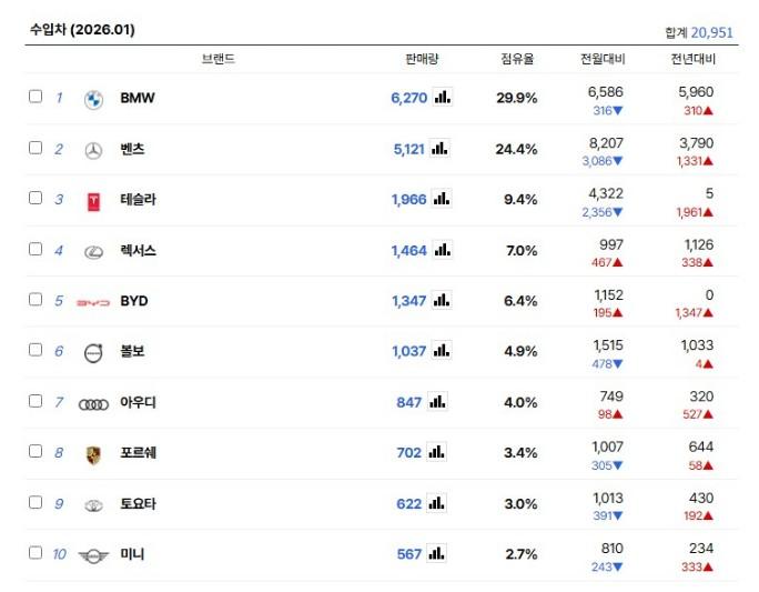 2026년 1월 수입차 판매량 (11) 이미지 26.02.10 20:17 추천 24 조회 3922 카리스마4097 작성글보기 신고 댓글 수입 자동차 판매 협회 자료 판매 브랜드 순위 판매 모델별 순위 추천 24 본 게시물을 뉴스 및 기타 매체에서 인용하실 때는 '보배드림' 출처 표기를 부탁드립니다 페북 트윗 밴드 카톡 카스 복사 스크랩 삭제 수정 신고 불법광고신고 목록