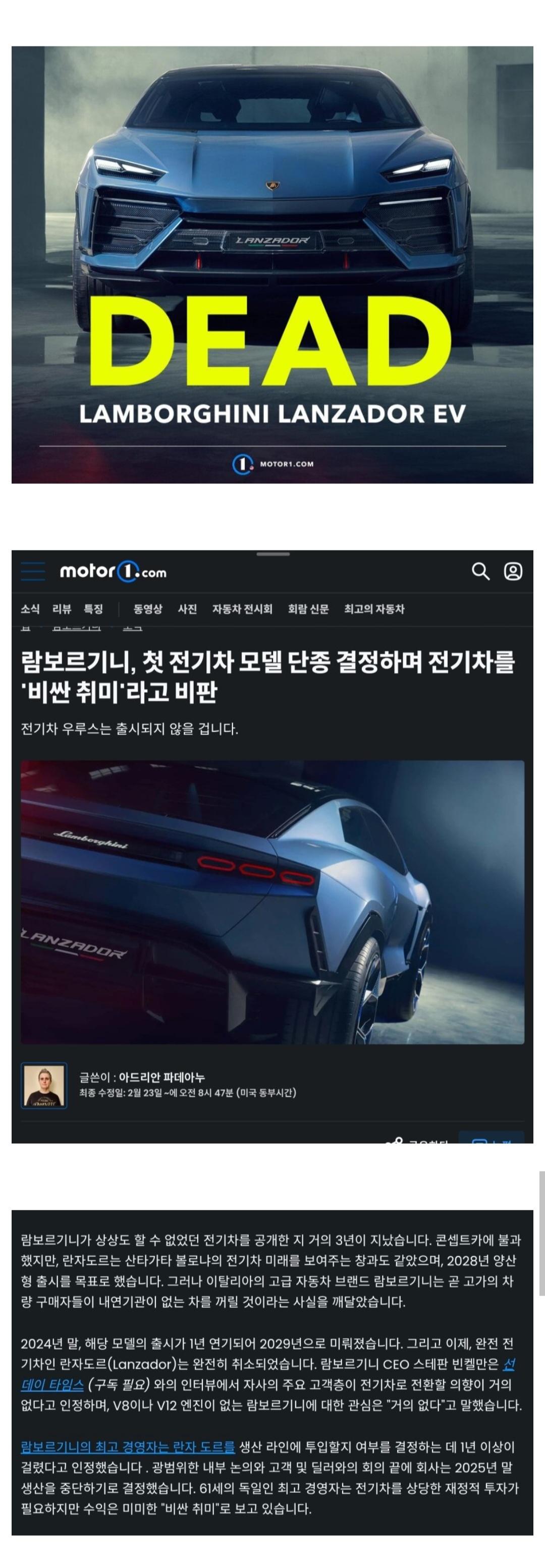 베플딱히 전기차 주도권을 중국 한국 등에 빼앗기니 뭐 후발주자로 나와봤자 람보나 포르쉐 페라리는 전기차로 나오는 순간 슈퍼카로써의 메리트가 사라짐. 묵직한 배기음과 제로백 등 이 모든건 내연기관이 전제되었을 때 빛을 발했는데 전기차로 넘어오면 이런 메리트들이 사라지니 오로지 브랜드값만 보고 람보르기니를 지르기엔 로스가 너무 크지. 그냥 전기차로 거자니 짜치니까 비싼 장난감이라 애써 폄하라며 포기한걸로 밖에 안보임.