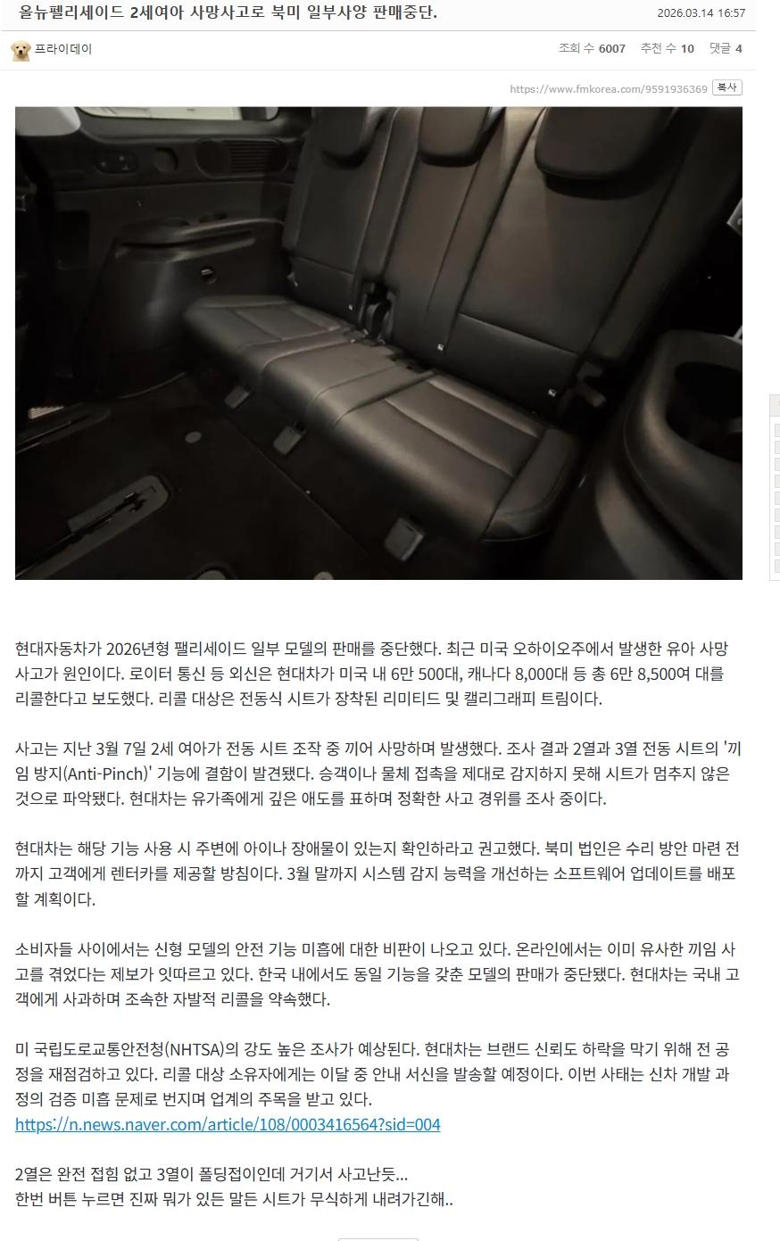 "팰리세이드서 2세 여아 사망" 현대차 판매 즉시 중단! (9) 이미지 26.03.17 20:38 추천 11 조회 2294 나폴리23 작성글보기 신고 댓글 www.fmkorea.com.jpeg" /> 추천 11 본 게시물을 뉴스 및 기타 매체에서 인용하실 때는 '보배드림' 출처 표기를 부탁드립니다 페북 트윗 밴드 카톡 카스 복사 스크랩 삭제 수정 신고 불법광고신고 목록