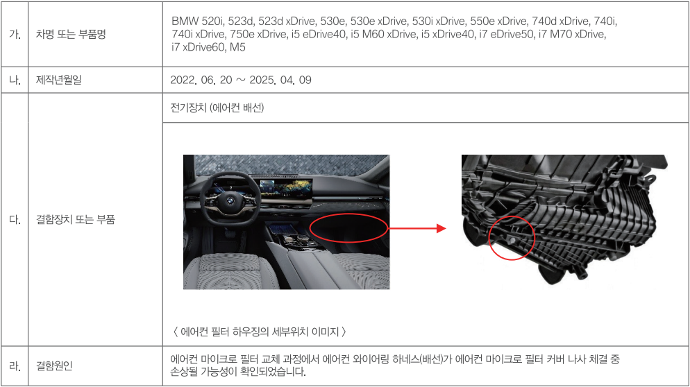 에어컨 마이크로 필터 교체 과정에서 에어컨 와이어링 하네스(배선)가 에어컨 마이크로 필터 커버 나사 체결 중 손상될 수 있으며, 이로인해 에어컨 배선이 손상될 경우 에어컨 장치가 오작동하거나 단락이발생 될 수 있고 단락이 발생된 경우 인스트루먼트 패널에서 연기가 발생되고, 화재 가능성을 배제할 수 없음이 확인됨에 따른 리콜